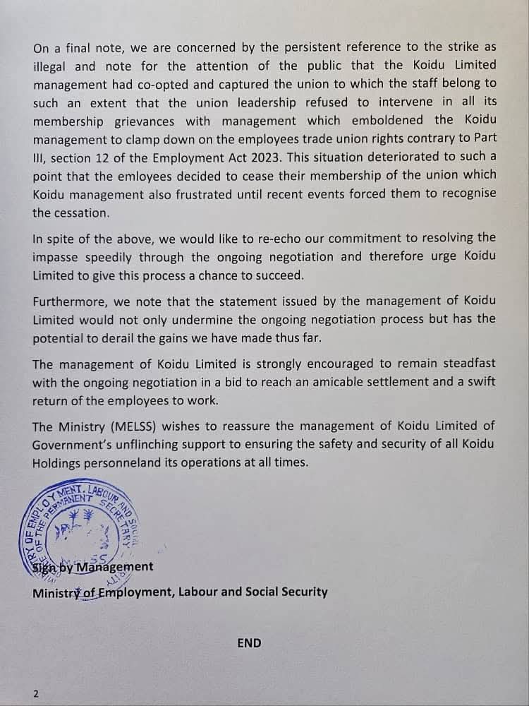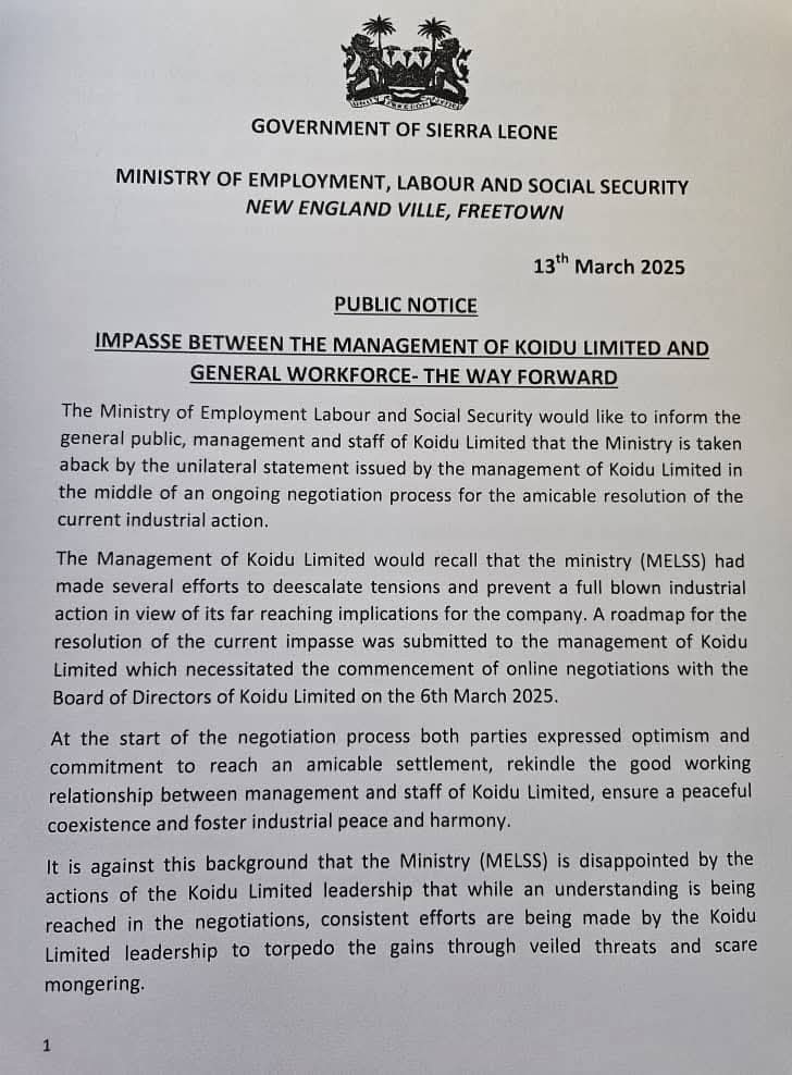 According to the Ministry, it has been actively engaged in de-escalating tensions between Koidu Limited and its staff to prevent a full-blown industrial action.