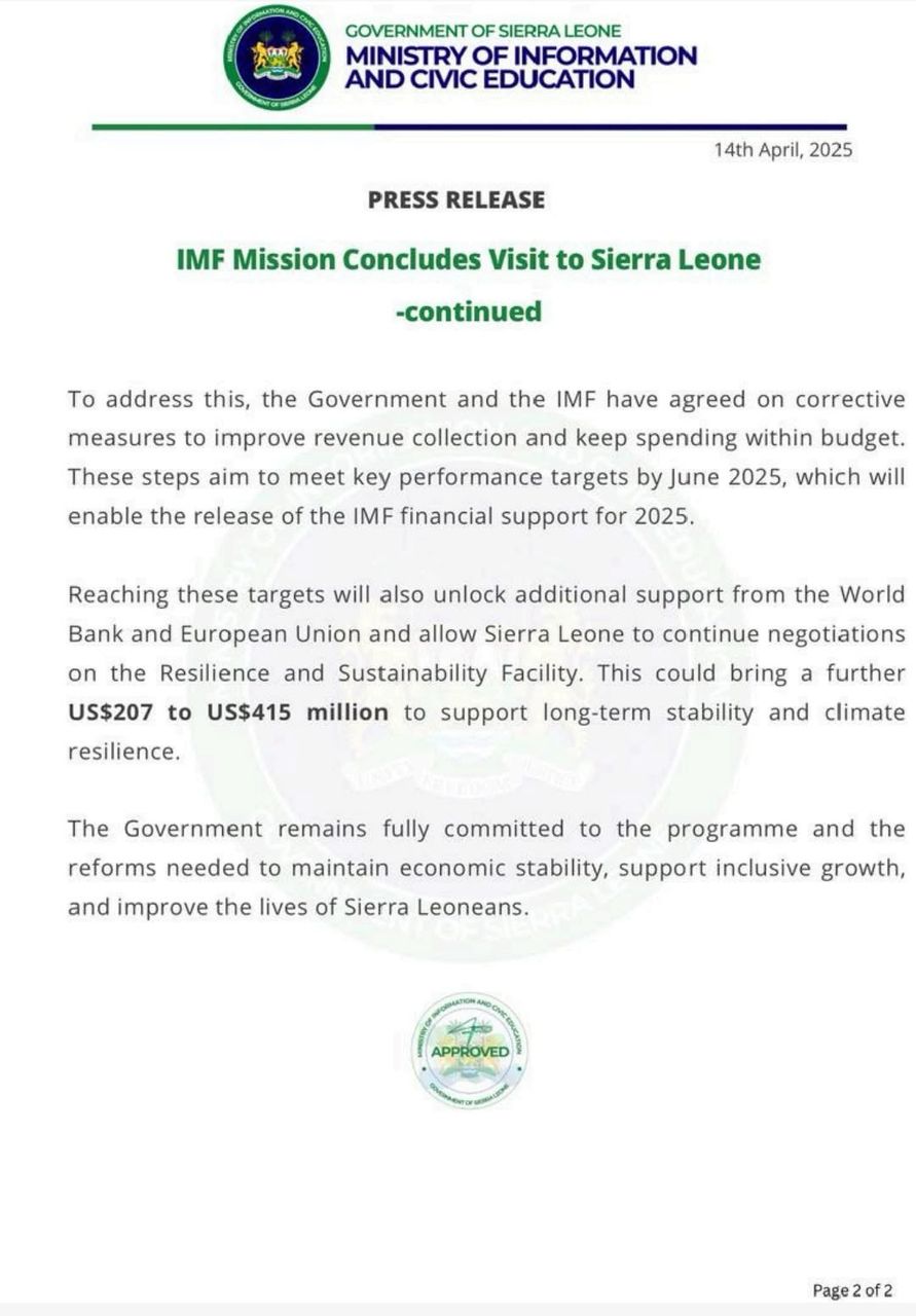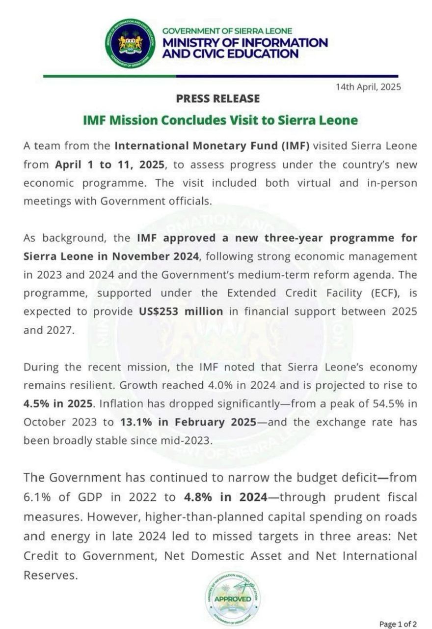 These issues were pointed out during a visit by the International Monetary Fund (IMF) from April 1 to 11, 2025, which reviewed progress under Sierra Leone’s new economic programme. The IMF said that the country’s economy is still strong, with growth expected to rise from 4.0% in 2024 to 4.5% in 2025. Inflation has dropped, from 54.5% in October 2023 to 13.1% in February 2025, and the exchange rate has been steady since mid-2023.
