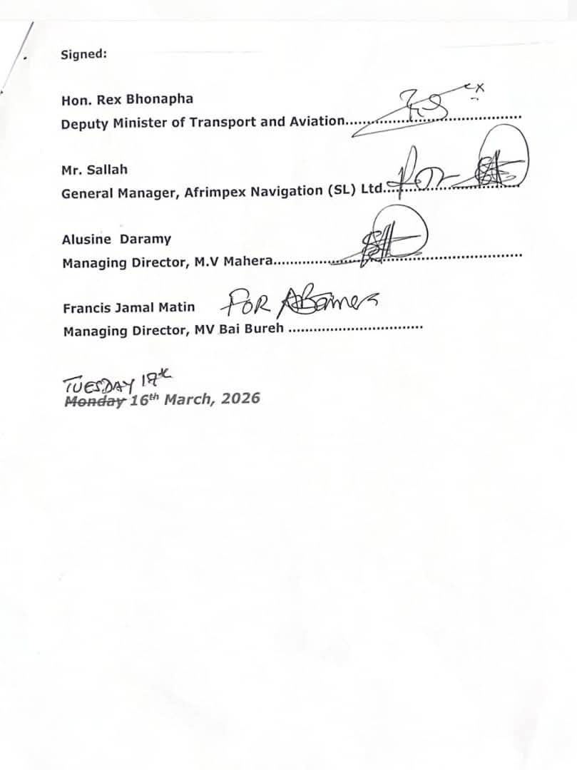The new fare structure was jointly signed by Deputy Minister of Transport and Aviation Hon. Rex Bhonapha, along with representatives from the major ferry operating companies, including Mr. Sallah of Afrimpex Navigation (SL) Ltd., Alusine Daramy of M.V. Mahera, and Francis Jamal Matin of MV Bai Bureh.