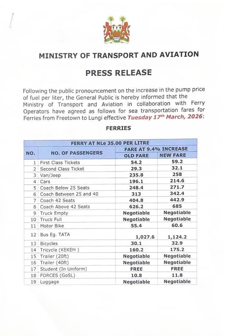 The Ministry of Transport and Aviation has announced new fare rates for ferry services operating between Freetown and Lungi, following last week’s increase in the pump price of fuel.