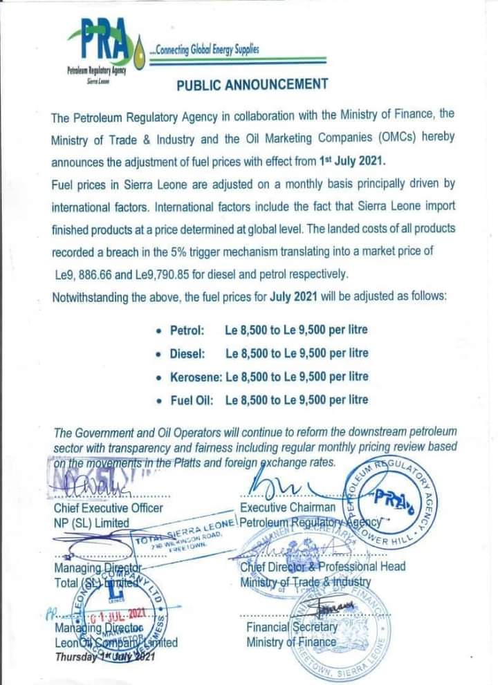 The Government of Sierra Leone through the Petroleum Regulatory Agency increased the pump price of fuel and other petroleum products in the country.