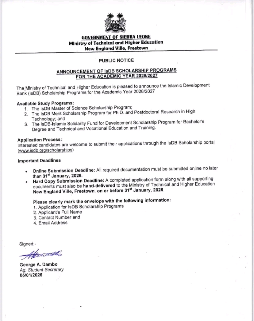 The Government of Sierra Leone, through the Ministry of Technical and Higher Education, has officially announced the availability of Islamic Development Bank (IsDB) Scholarship Programmes for the 2026/2027 academic year.