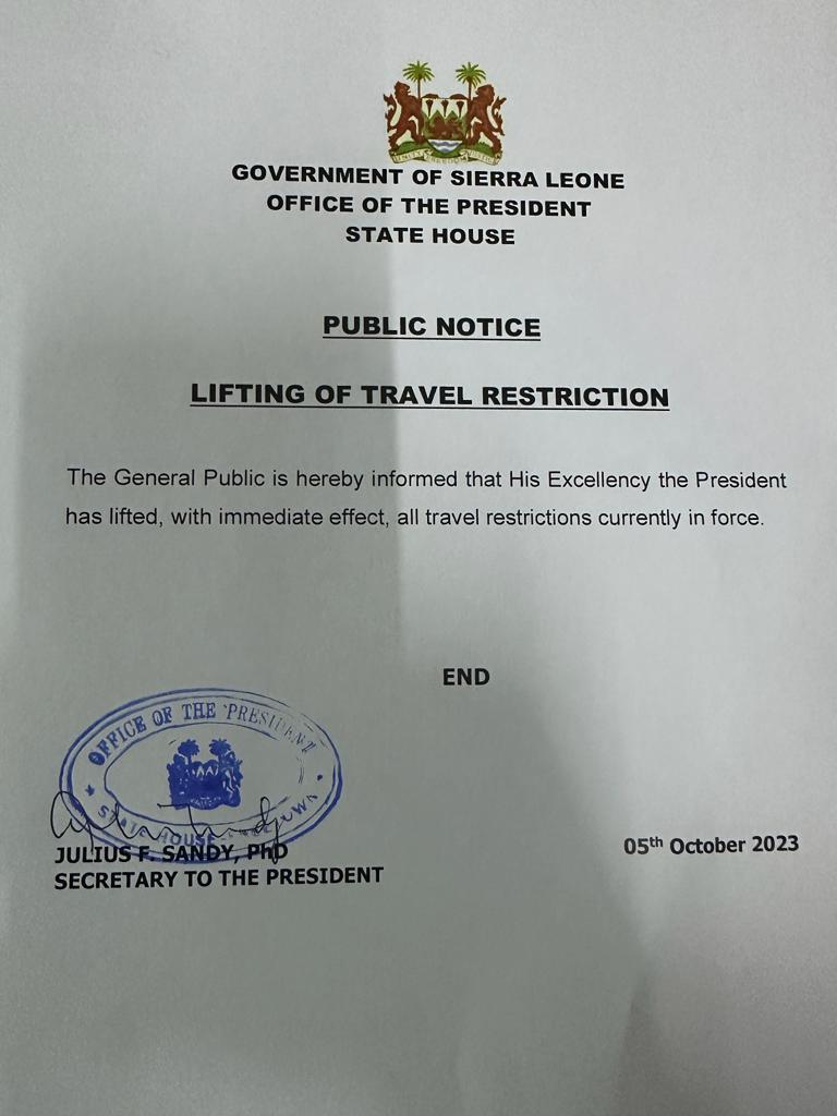 The government of sierra Leone has in a press release officially announced the immediate lifting of all existing travel restrictions.