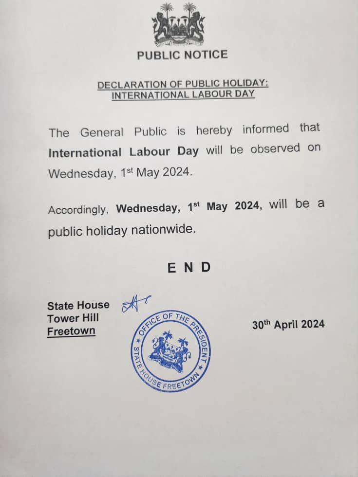 The Government of Sierra Leone has officially declared Wednesday, May 1st, 2024, as a public holiday nationwide, in observance of International Labour Day.