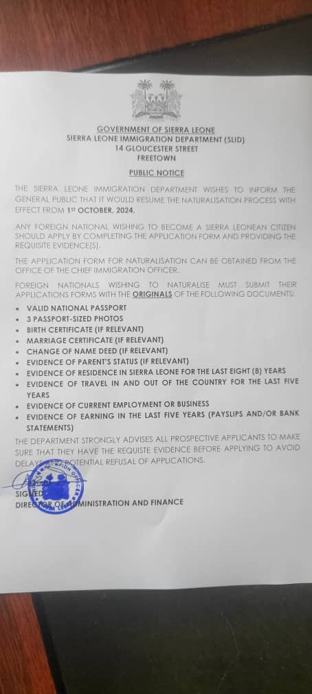 In a public notice issued by the Sierra Leone Immigration Department, the Naturalization process will resume on 15th October, 2024.