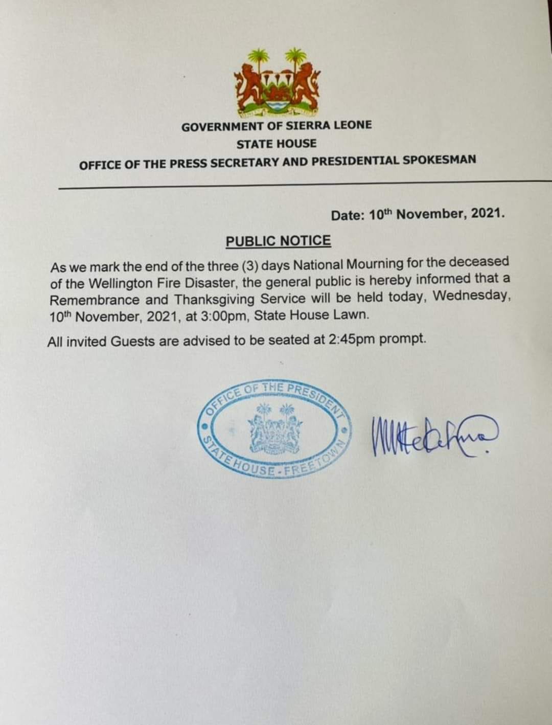 To mark the end of the three days National Mourning for our loved ones whom we lost to the Fuel Tanker Explosion, a Remembrance and Thanksgiving Ceremony will be held today the 10th November 2021.