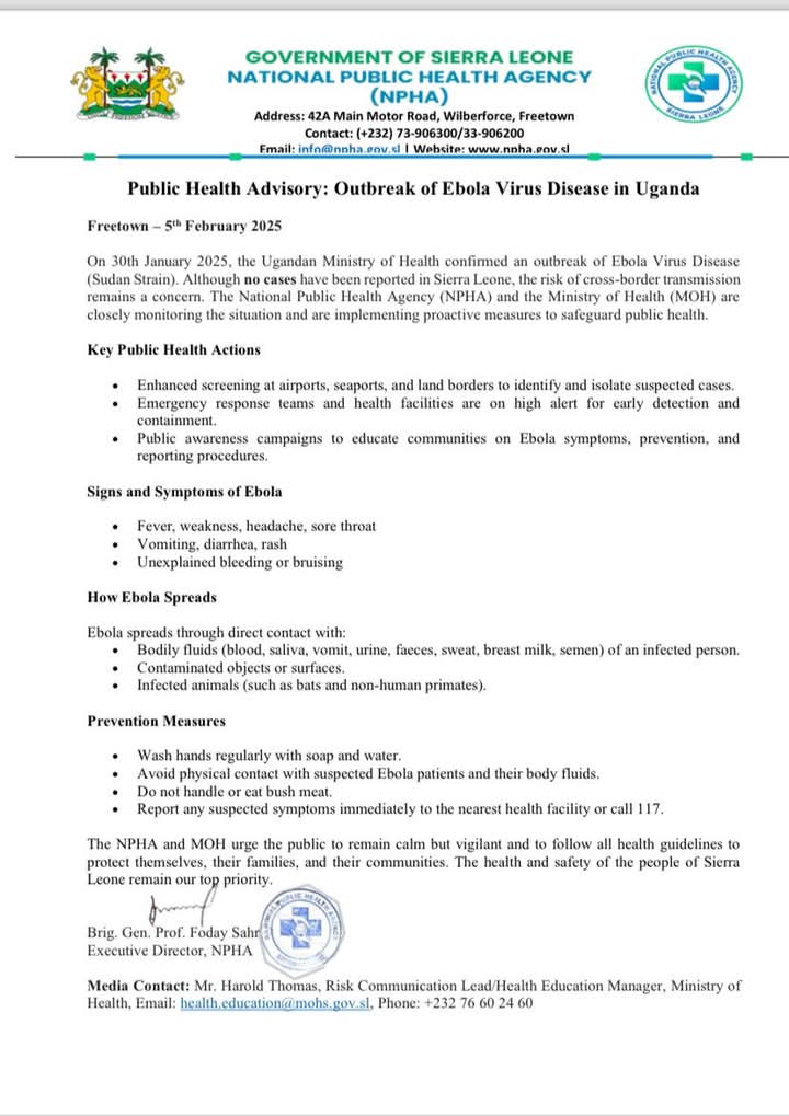 The Ugandan Ministry of Health confirmed on January 30, 2025, that the Sudan strain of the Ebola virus has resurfaced in the country. While no cases have been reported in Sierra Leone, authorities are taking proactive steps to prevent cross-border transmission.