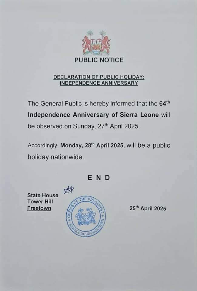 As this announcement is made, citizens are reminded to plan accordingly and observe the public holiday in honor of Sierra Leone’s independence.