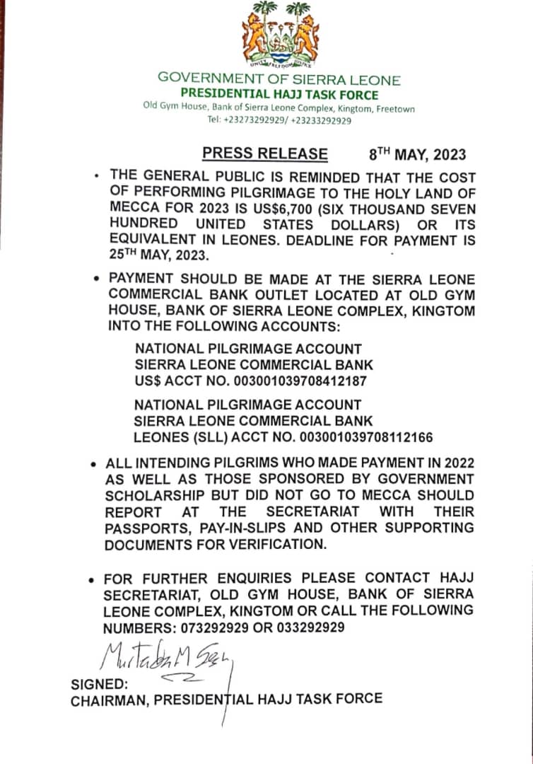 Sierra Leone’s Presidential Hajj Task Force has issued a reminder to the public that the cost of performing the pilgrimage to the holy land of Mecca for 2023 is US$6,700 or its equivalent in leones. The deadline for payment is May 25th, 2023.
