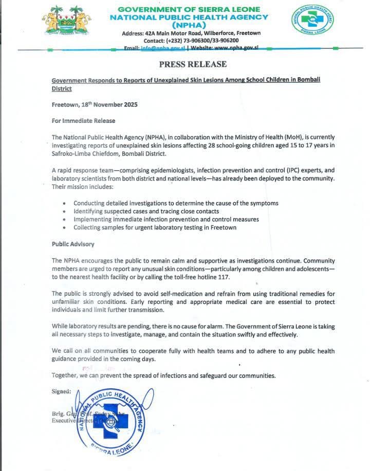 The National Public Health Agency (NPHA), in close cooperation with the Ministry of Health (MoH), has launched a rapid response investigation into an outbreak of unexplained skin lesions affecting dozens of students in the Bombali District.
