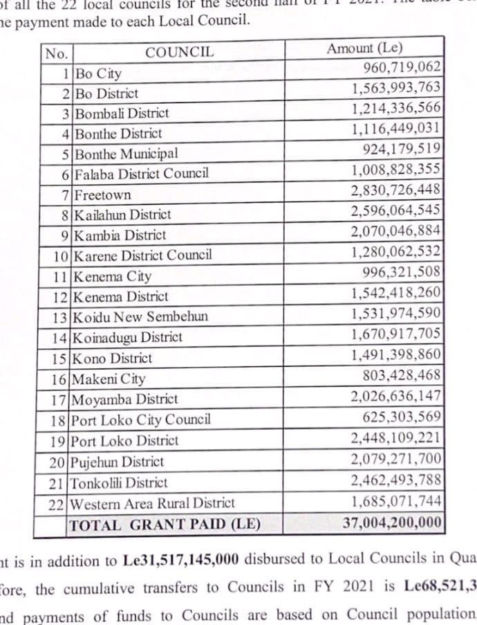 The Government of Sierra Leone has revealed payment of the second half of the financial year to the twenty two Local Councils in the country. The government of Sierra Leone through the Ministry of Finance has paid the sum of le37,004,200,000 into the respective administrative Bank Accounts of the twenty two local councils in the country.