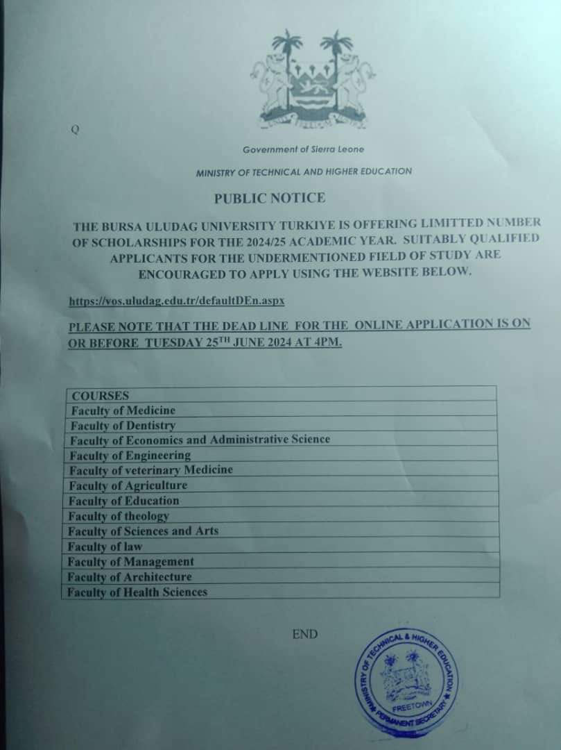 The Ministry of Technical and Higher Education of Sierra Leone has announced a public notice regarding scholarship opportunities offered by Bursa Uludağ University in Turkey for the 2024/25 academic year.