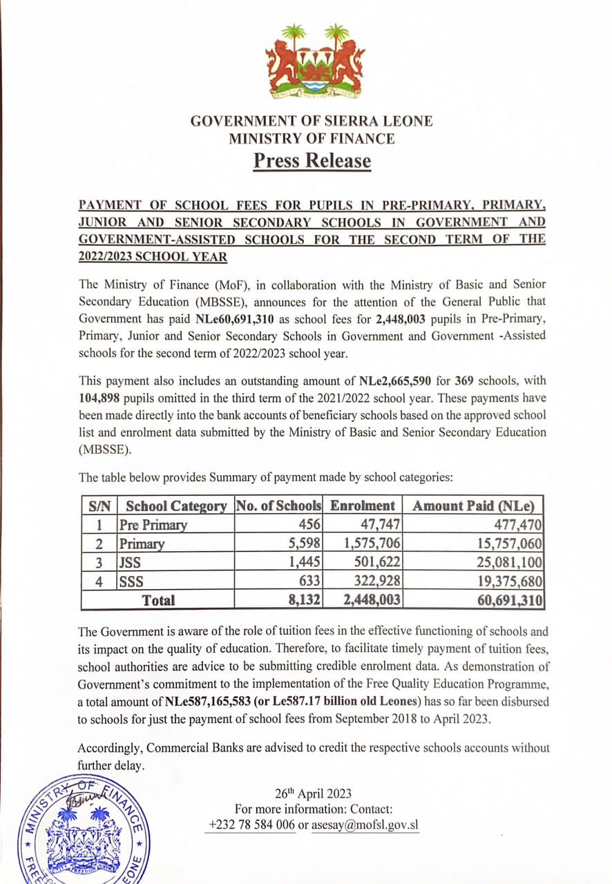 The Government of Sierra Leone through the Ministry of Finance in collaboration with the Ministry of Basic and Senior Secondary Education (MBSSE) has made payment of NLe60,691,310 as second-term school fees for 2,448,003 pupils in Pre Primary, Primary, Junior, and Senior Secondary Schools in Government and Government Assisted Schools for the 2022/2023 academic year.