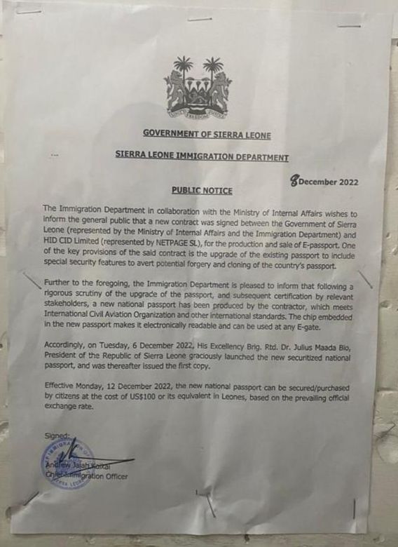 The Immigration Department in collaboration with the Ministry of Internal Affairs has announced that the new national passport can be secured or purchased by citizens at the cost of US$100 or its equivalent in Leones, effective Monday, 12 December 2022.