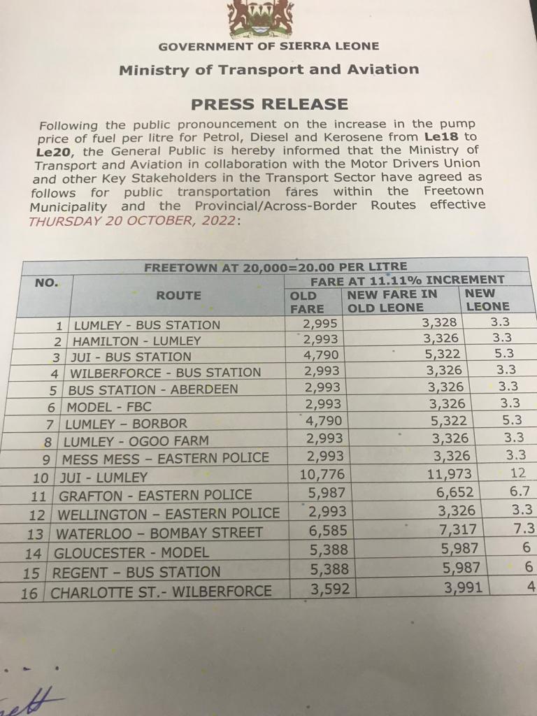 The Government of Sierra Leone through the Ministry of Transport and Aviation, has today the 20th October, 2022 announced new prices for transportation to the various routes in the country.