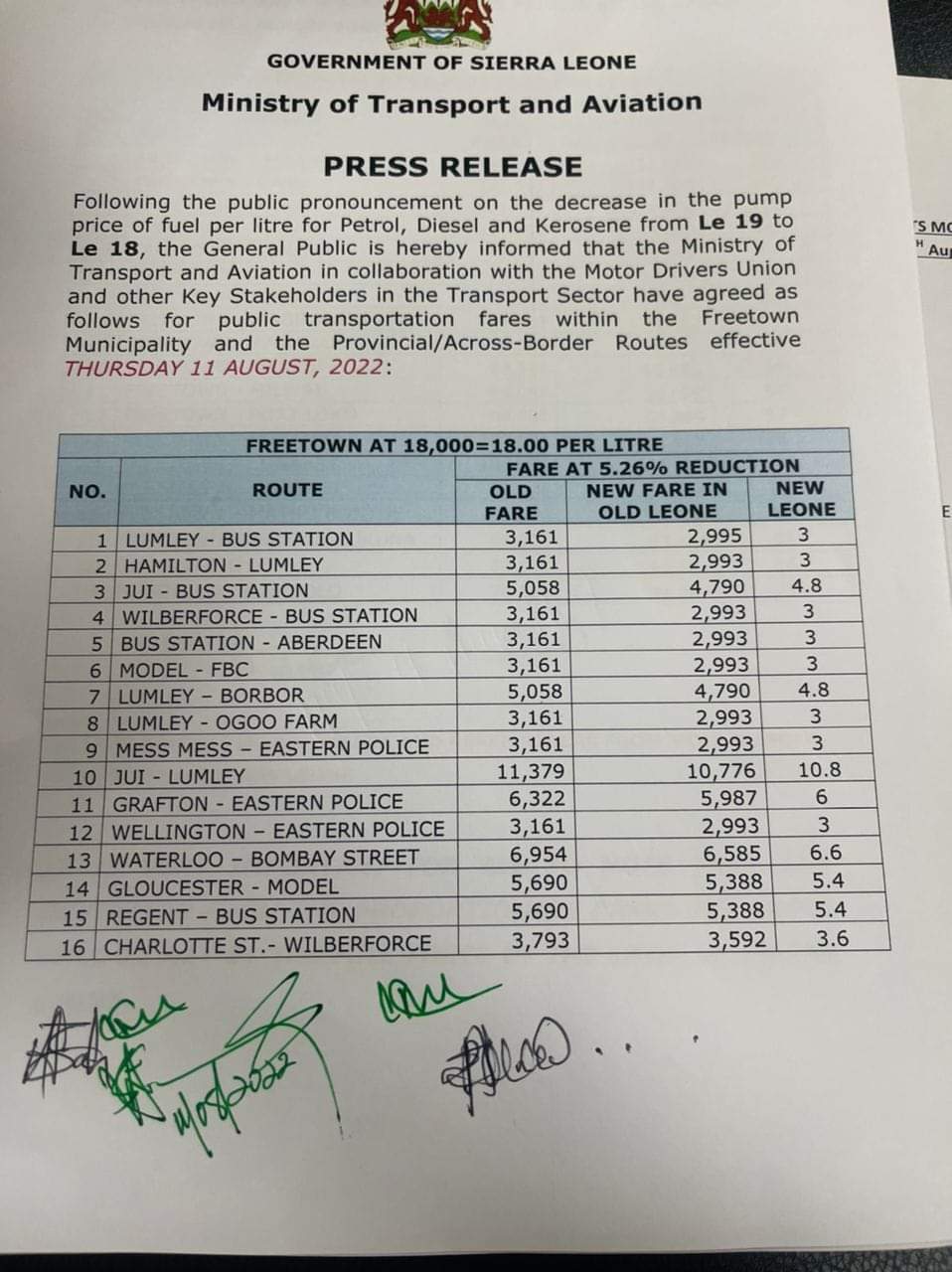 “Following the public pronouncement on the decrease in the pump price of fuel per litre for Petrol, Diesel and Kerosene from Le 19 to Le 18, the General public is hereby informed that the Ministry of Transport and Aviation in collaboration with the Motor drivers Union and other key Stakeholders in the Transport Sector have agreed as follows for public transportation fares within the Freetown Municipality and the Provincial/Across-Border Routes effective Thursday 11th August, 2022.”