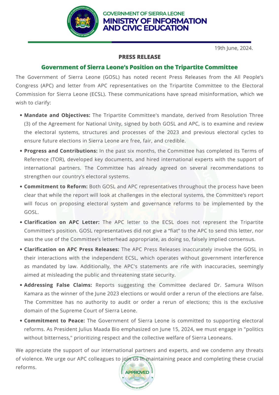 The Government of #SierraLeone (GOSL) has issued a press release addressing recent communications from the All Peoples’ Congress (APC) concerning the Tripartite Committee and the Electoral Commission for Sierra Leone.