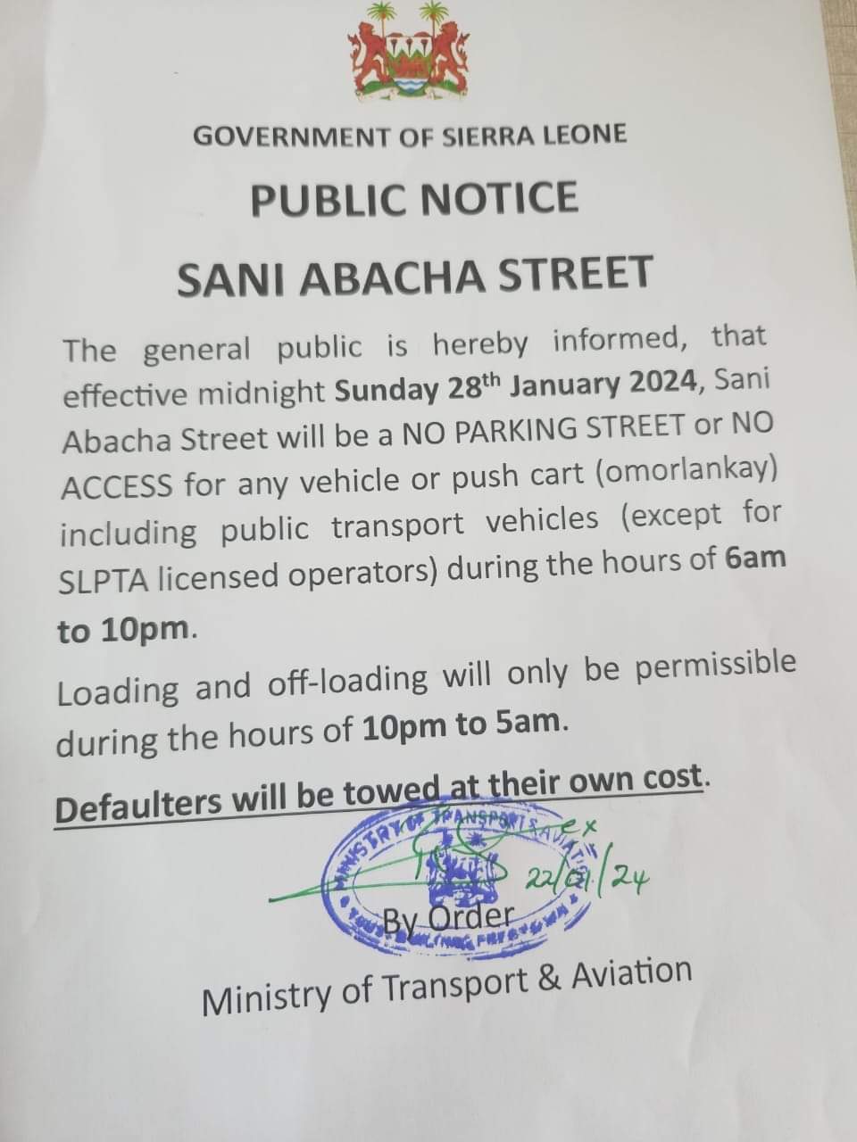 In a recent public Notice, the Government of Sierra Leone through the ministry of Transport and Aviation has announced stringent regulations for Sani Abacha Street, effective midnight on Sunday, January 28, 2024.