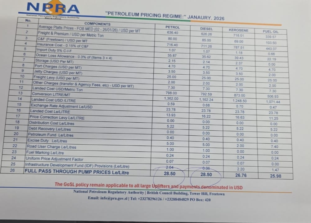 The Government of Sierra Leone, through the National Petroleum Regulatory Authority (NPRA), has announced an immediate increase in the pump price of petroleum products for January 2026.