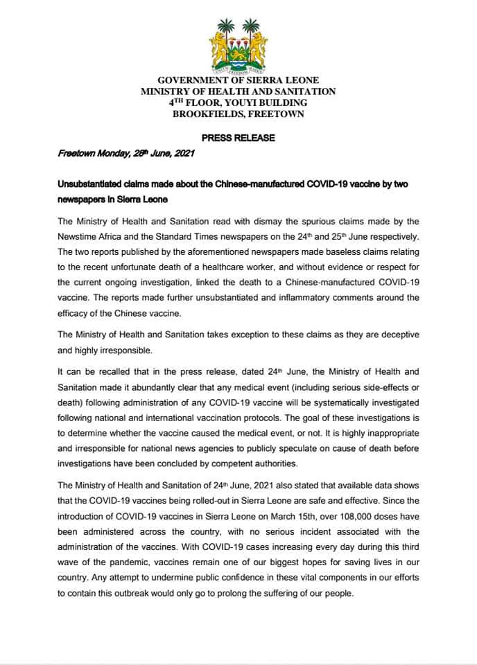 The Ministry of Heaith and Sanitation takes exception to these claims as they are deceptiveand highly iresponsible.t can be recalled that in the press release, dated 24 June, the Ministry of Health andSanitation made it abundantly clear that any medical event (including serious side-effects ordeath) following administration of any CoviD-19 vaccine will be systematically investigatedfollowing national and international vaccination protocols.