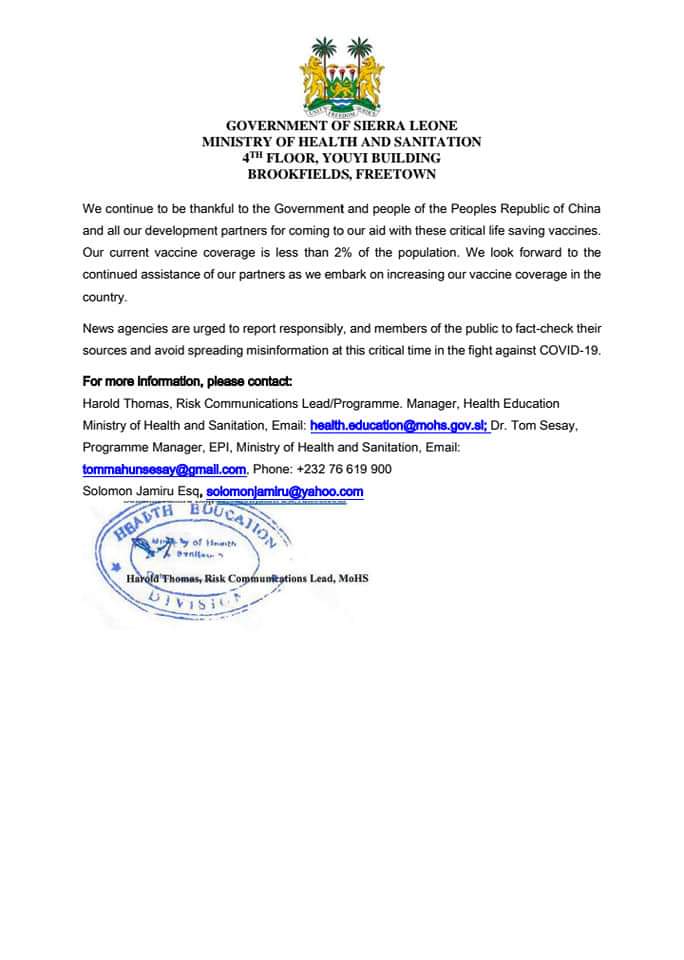 The Government through the Ministry of Health and Sanitation has today June 28, 2021 issued a statement on the issue with China’s COVID-19 Vaccine.