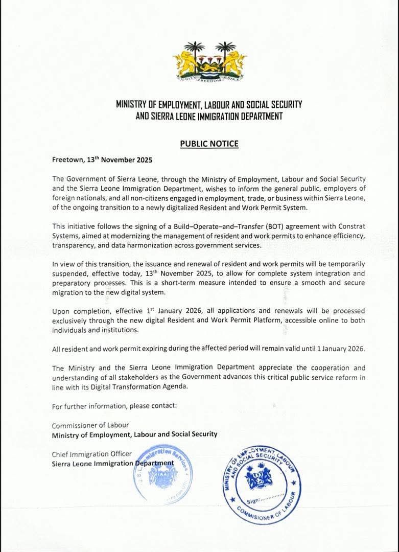 In a joint statement, the Ministry of Employment, Labour and Social Security and the Sierra Leone Immigration Department expressed appreciation for the public’s cooperation and patience during the transition. They emphasized that this reform is a key component of the government’s Digital Transformation Agenda, which seeks to modernize public service delivery, improve accountability, and strengthen data-driven governance.