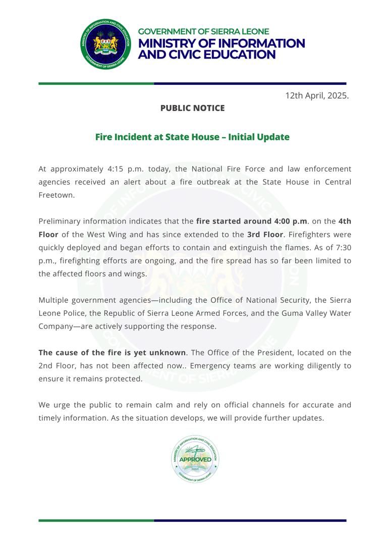 According to a public notice issued by the Ministry of Information and Civic Education, the alert was received at approximately 4:15 p.m. Initial reports indicate the fire originated on the 4th floor of the West Wing around 4:00 p.m. and has since spread to the 3rd floor of the building.