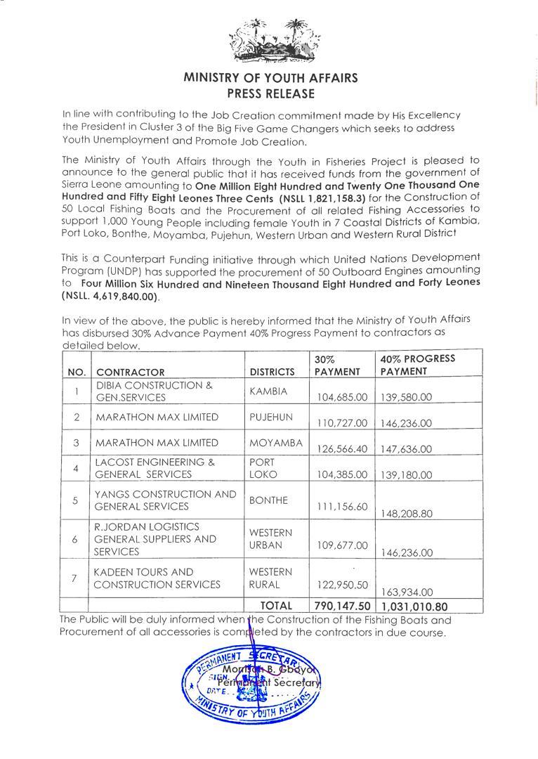 Sierra Leone’s Ministry of Youth Affairs, in collaboration with the United Nations Development Program (UNDP), has launched an initiative to support young people in coastal districts. The project will see the construction of 50 local fishing boats and provide related fishing accessories to benefit 1,000 young people, including women, across seven districts.