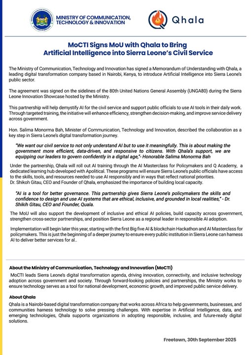 The Ministry of Communication, Technology and Innovation (MoCTI) has signed a Memorandum of Understanding (MoU) with Qhala, a Nairobi-based digital transformation company, to integrate Artificial Intelligence (AI) into Sierra Leone’s civil service.