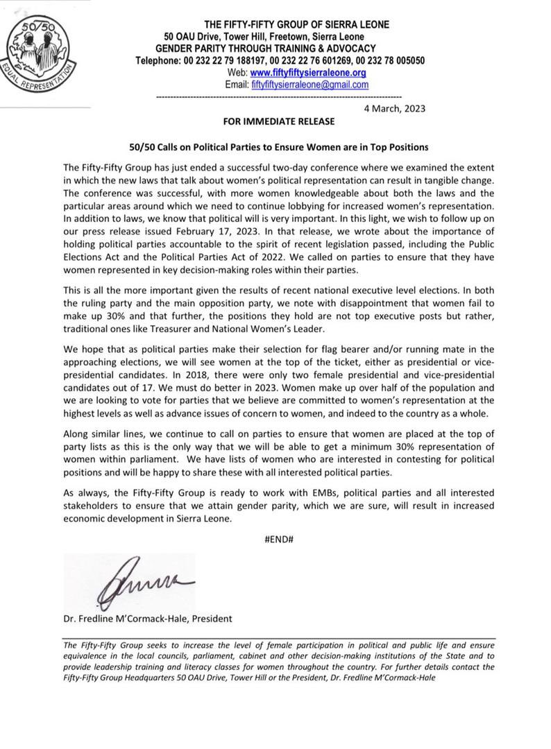 ‘’As always, the fifty-fifty group is ready to work with EMBs, political parties, and all interested stakeholders to ensure that we attain gender parity, which we are sure, will result in increased economic development in Sierra Leone,’’ they stated.