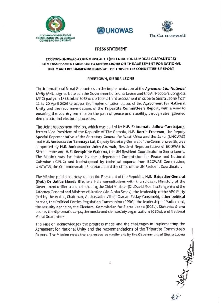 A high-level joint assessment mission by international moral guarantors has concluded a week-long review of the implementation of the Agreement for National Unity (ANU) and recommendations of the Tripartite Committee in Sierra Leone, urging sustained dialogue, political restraint, and accelerated reforms ahead of the 2028 general elections.