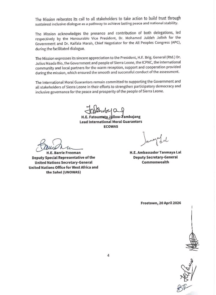 The mission, jointly undertaken by the Economic Community of West African States (ECOWAS), the United Nations Office for West Africa and the Sahel (UNOWAS), and the Commonwealth Secretariat, was in Sierra Leone from 13 to 20 April 2026.