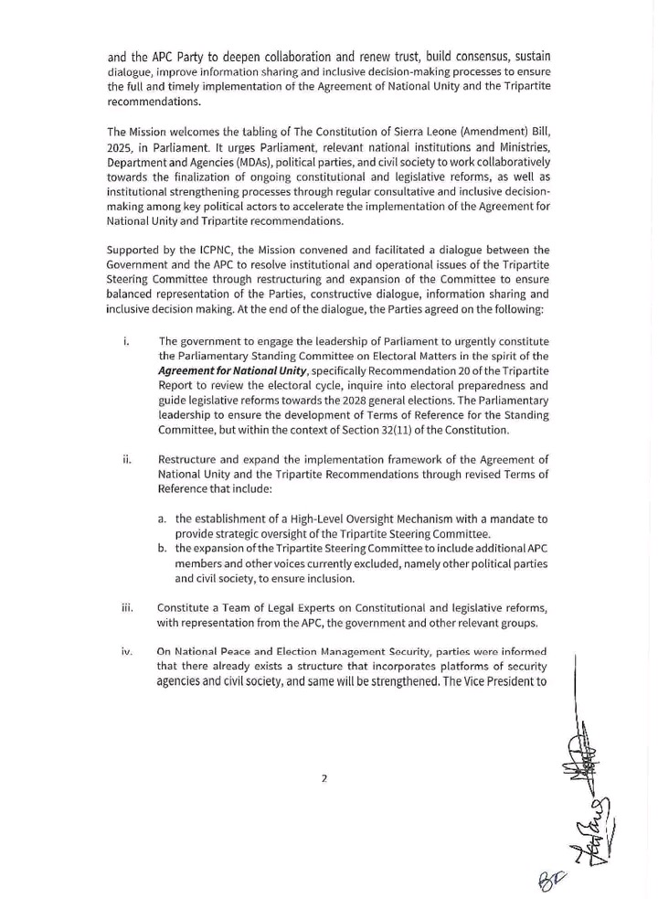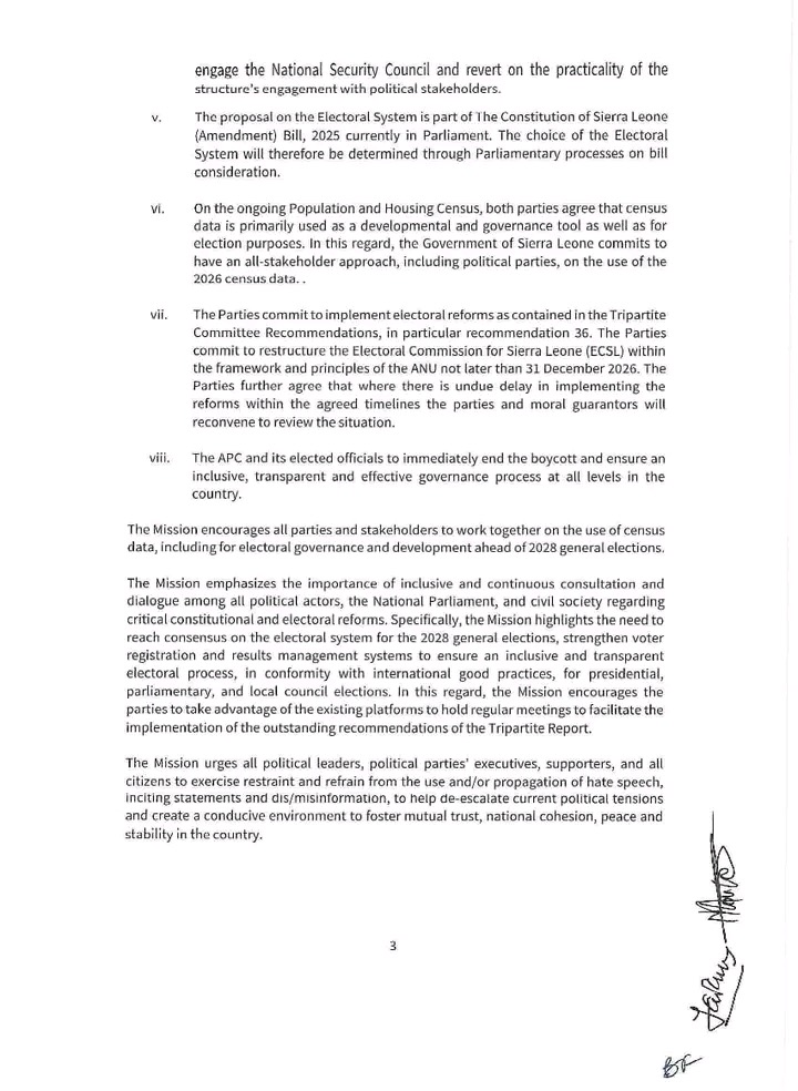 The mission further stressed the need for electoral reforms, including the restructuring of the Electoral Commission for Sierra Leone (ECSL), which parties agreed should be completed by 31 December 2026 under the Tripartite framework. It warned that delays in implementation could trigger a review by the guarantors and stakeholders.