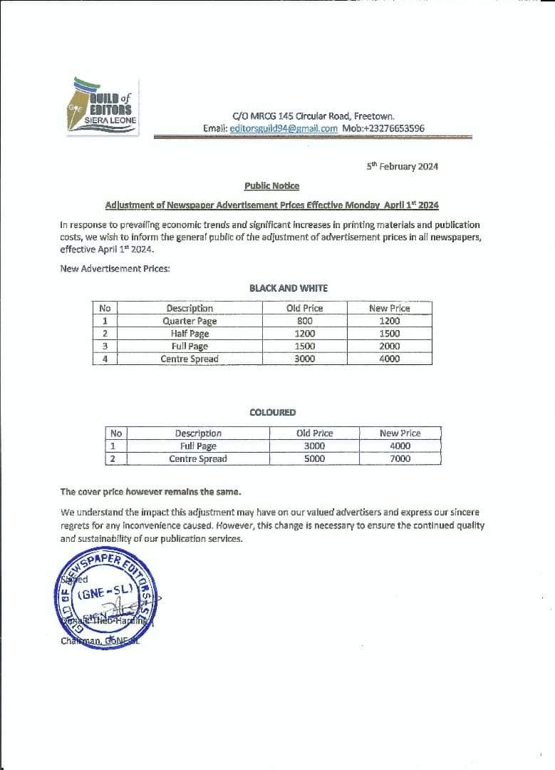 Guild of Newspaper Editors Sierra Leone has adjusted prices of advertisements in all Newspapers across the country. This was announced in a public notice on Monday 5th February, 2024.