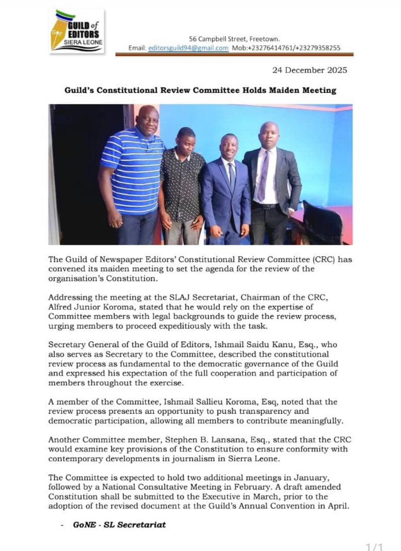 Secretary General of the Guild of Editors, Ishmail Saidu Kanu, Esq., who also serves as Secretary to the Committee, described the constitutional review as critical to the democratic governance of the Guild.