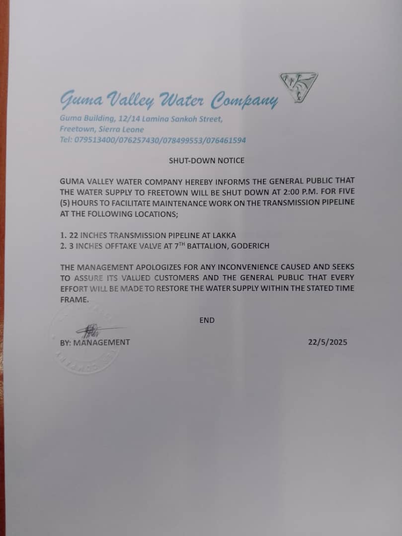 Freetown residents are experiencing a temporary disruption to their water supply today, May 22, 2025, as the Guma Valley Water Company has initiated a five-hour shutdown for essential maintenance work.