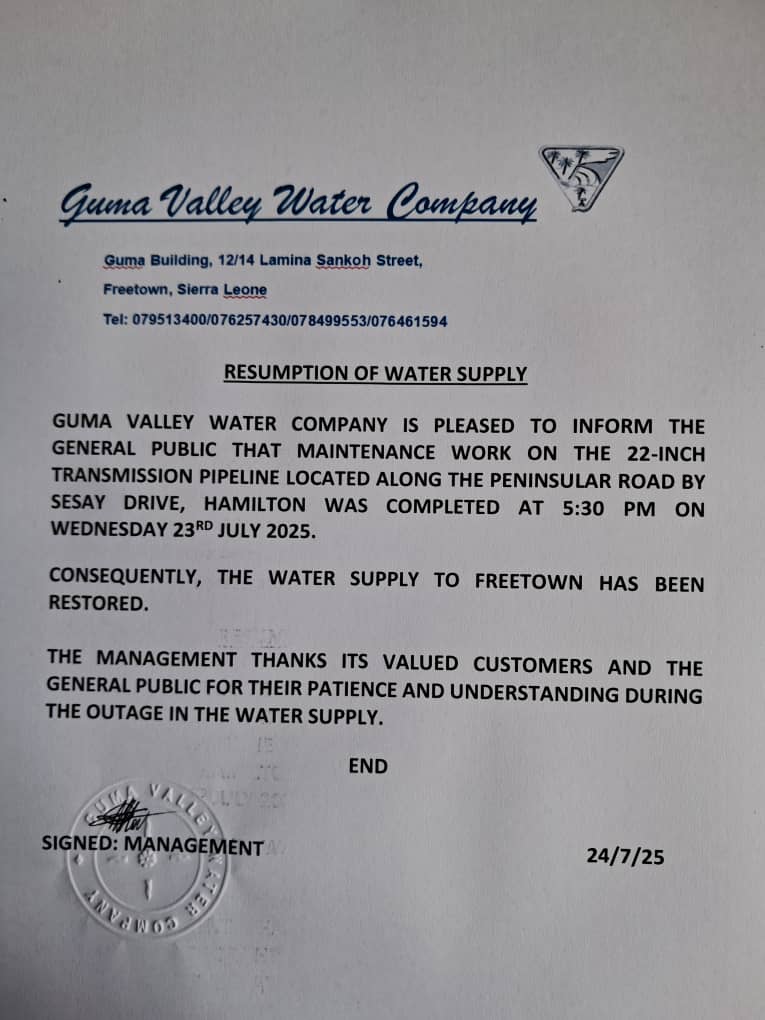 Furthermore, today, 24 July 2025, a public notice from Guma Valley stated, ‘’Consequently, the Water Supply to Freetown Has Been Restored.’’