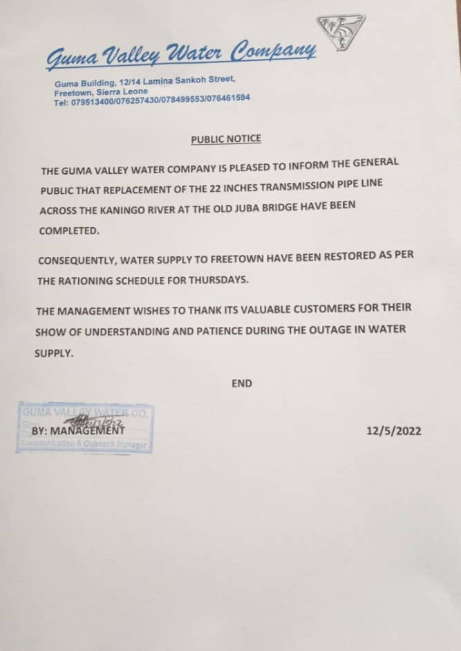 Consequently, water supply to Freetown have been restored as per the rationing schedule for Thursdays.