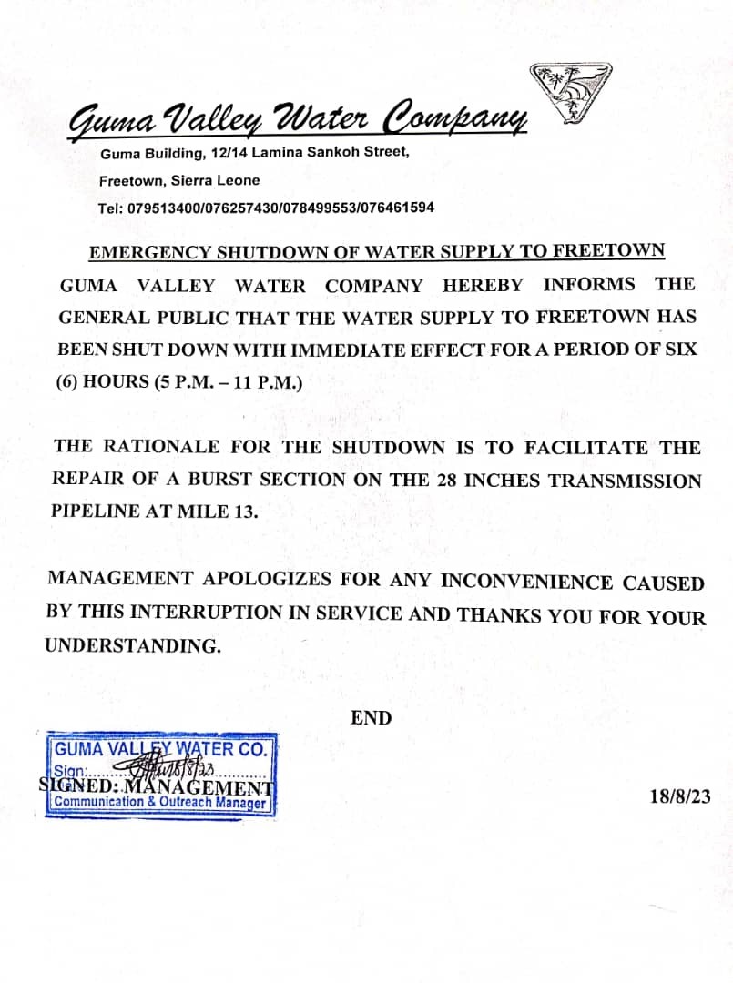 In a press release issued 18 August 2023, the Management of the Guma Valley Water Company stated that this shutdown will take effect immediately. The Company is informing the public of that the water supply to Freetown has been shut down with immediate effect for a period of six Hours (5 p.m. – 11 p.m.).