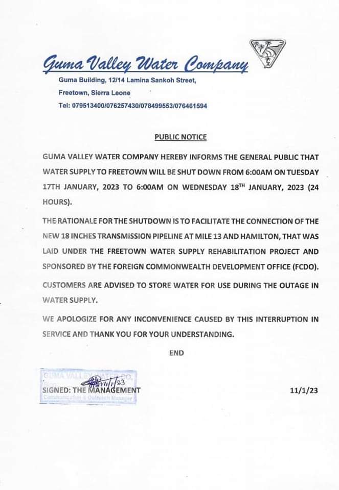 The Guma Valley Water Company has in a release announced that it will shut down water supply to Freetown on Tuesday 17th January, 2023 for a period of 24 hours.
