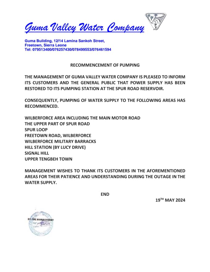 In an official statement released on May 19, 2024, the management of Guma Valley Water Company expressed their gratitude to customers for their patience and understanding during the disruption. The power restoration has allowed the company to resume pumping water to multiple areas, including Wilberforce and its main motor road, the upper part of Spur Road, Spur Loop, Freetown Road in Wilberforce, Wilberforce Military Barracks, Hill Station (particularly around Lucy Drive), Signal Hill, and Upper Tengbeh Town.