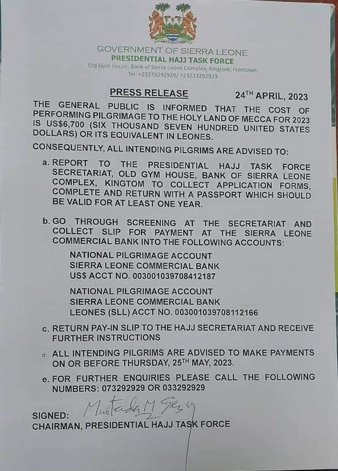 “ The General Public is informed that the cost of performing pilgrimage to the holy land of mecca for 2023 is us$6,700 (six thousand seven hundred united states dollars) or its equivalent in Leones.