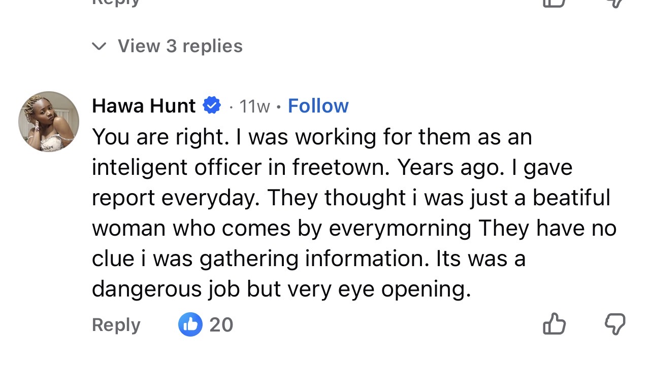 Sierra Leonean reality television personality Hawa Hunt has revealed that she previously worked as an information gatherer for a United States intelligence service, a disclosure that has raised concerns about national security and the legal risks associated with intelligence activities for foreign governments.