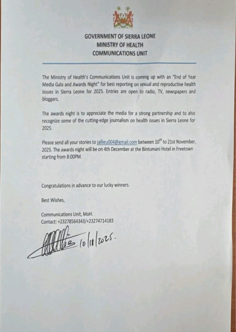 The Ministry of Health of Sierra Leone, through its Communications Unit, has announced an “End of Year Media Gala and Awards Night” to recognize outstanding reporting on sexual and reproductive health issues in the country for 2025.