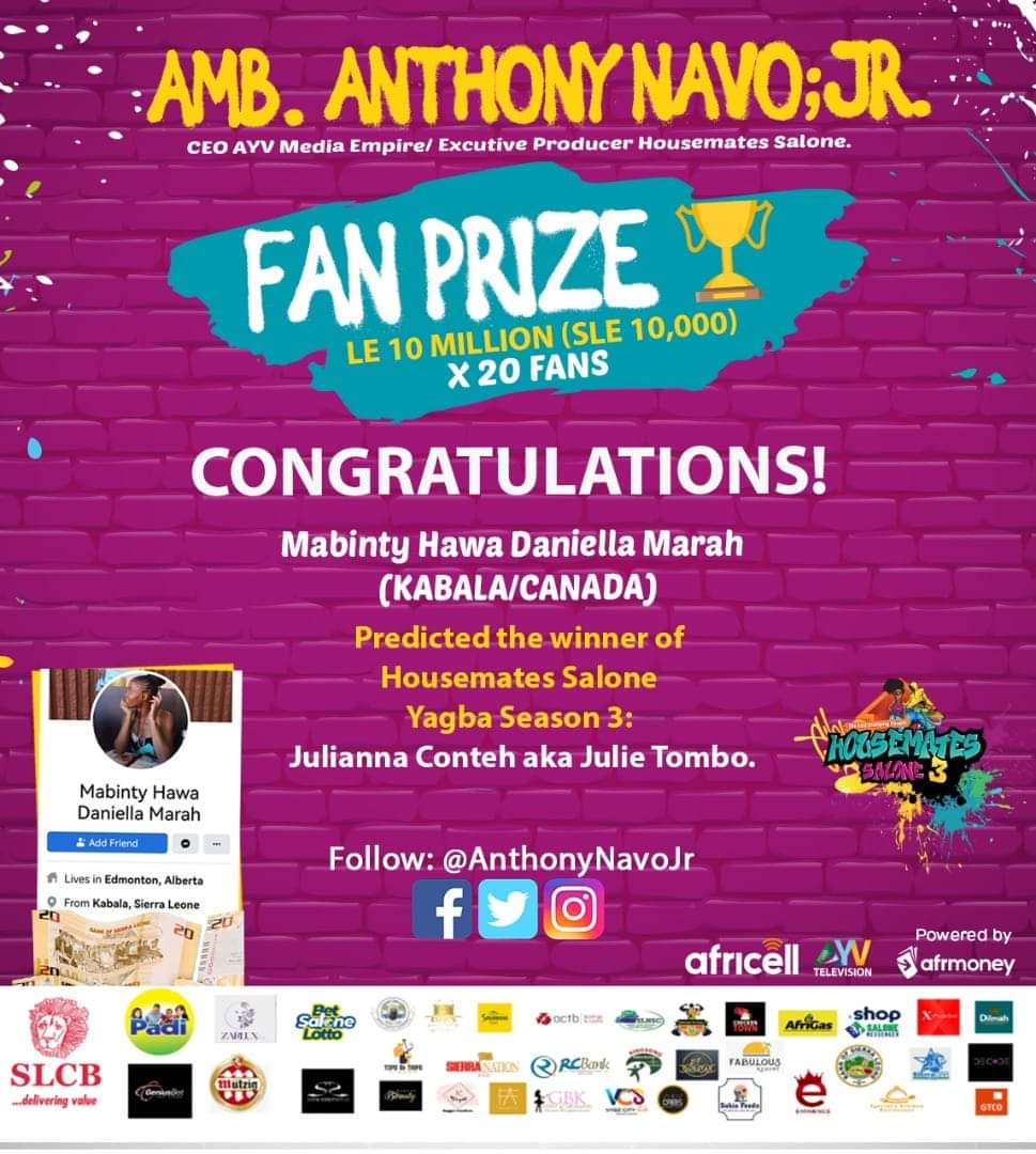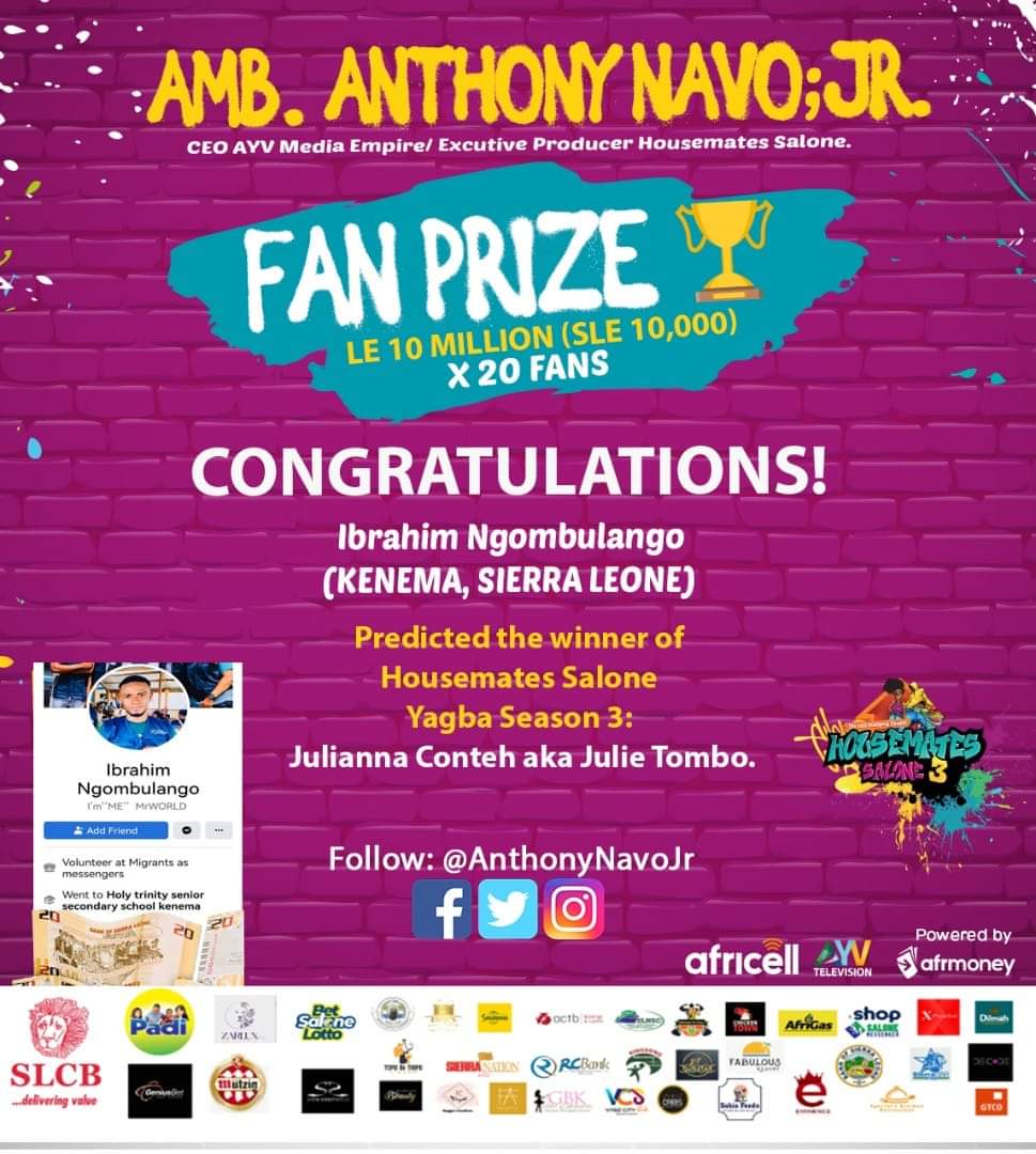 Amb Navo made this Announcement on his Facebba”.ook page where he disclosed that LE 10 Million (SLE 10,000) is the total prize money for Fans who predicted the winner of the just concluded Housemates Salone Season 3 and will feature 20 fans to get Le 500,000 (SLE 500) each