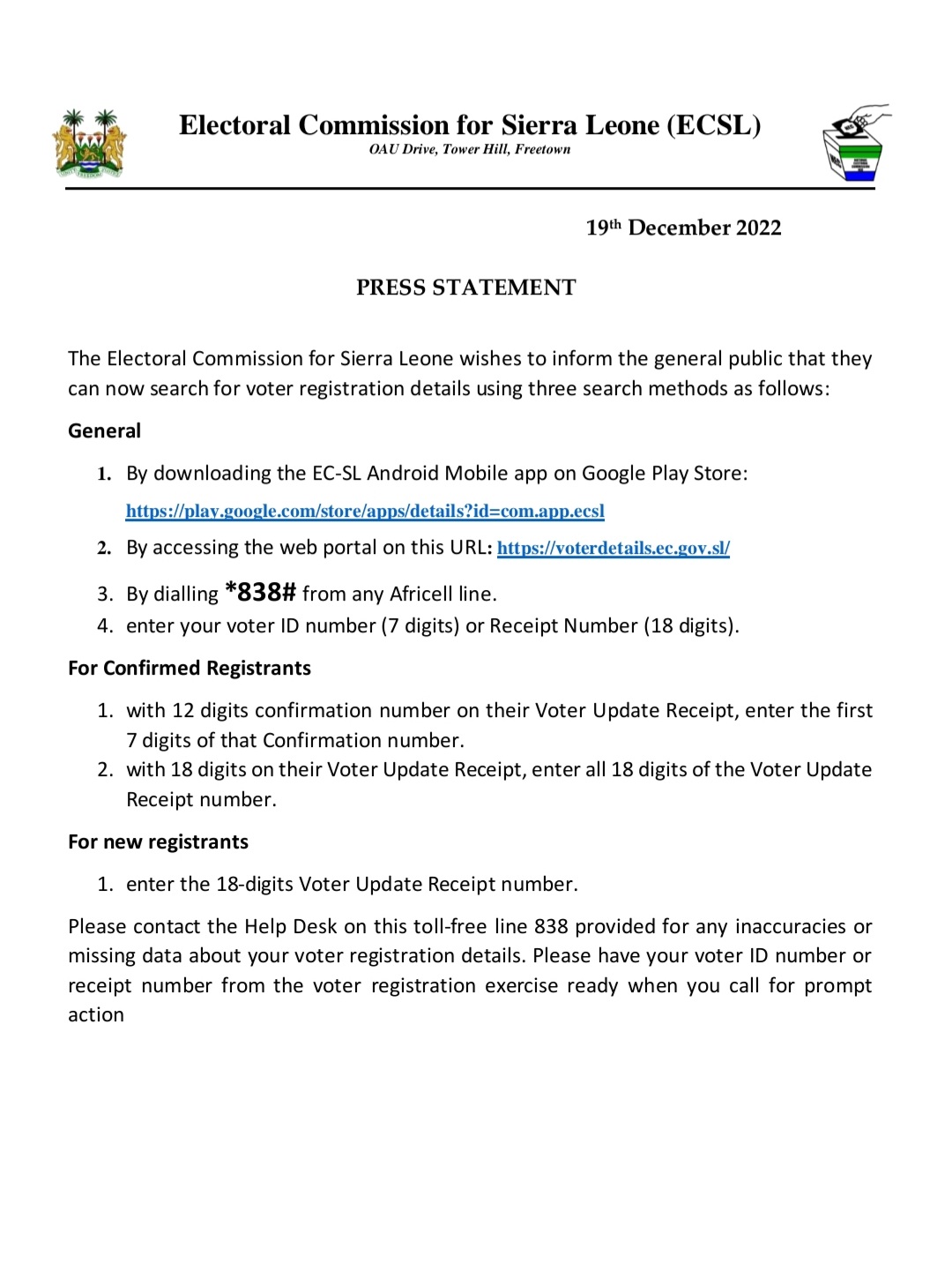 The Electoral Commission for Sierra Leone (ECSL) has informed the general public that they can now search for their voter registration details on the web and on mobile phones.