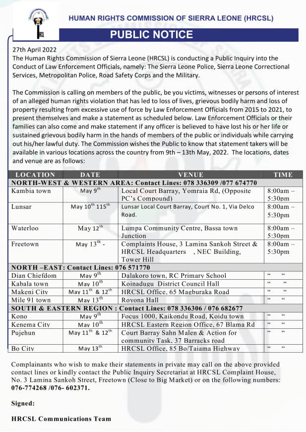 Freetown, May 13 at Complaint House, 03 Lamina Sankoh Street and HCRSL Headquarters, NEC Building, Tower Hill from 8:00 am to 5:30 pm.