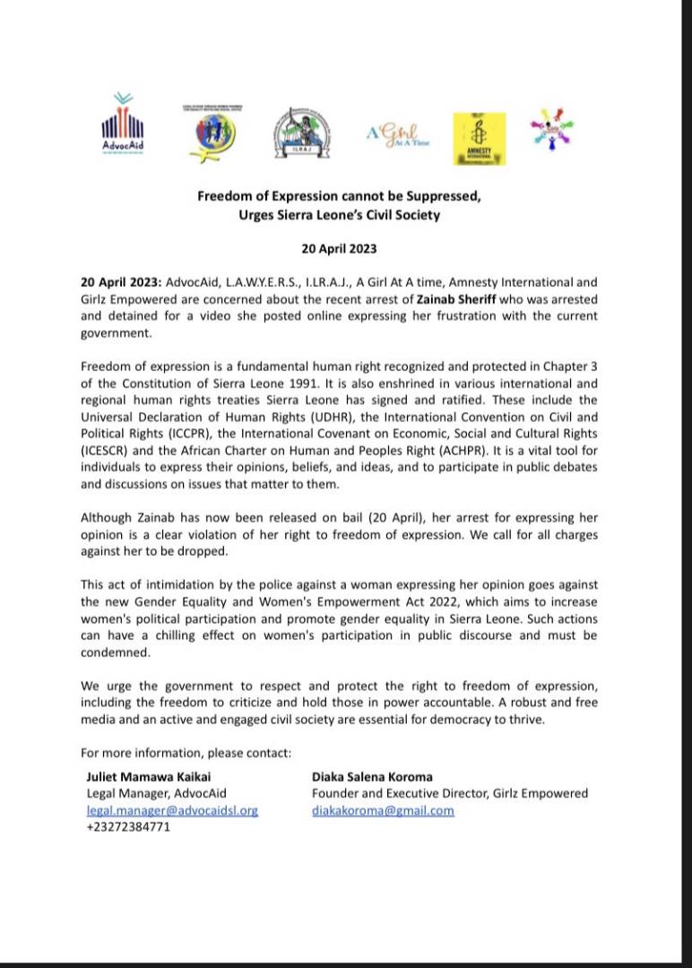 AdvocAid, LA.W.Y.E.R.S., I.LR.A.J., A Girl At a time, Amnesty International, and Girlz Empowered, has on a press release denounced the recent arrest and detention of Zainab Sheriff.