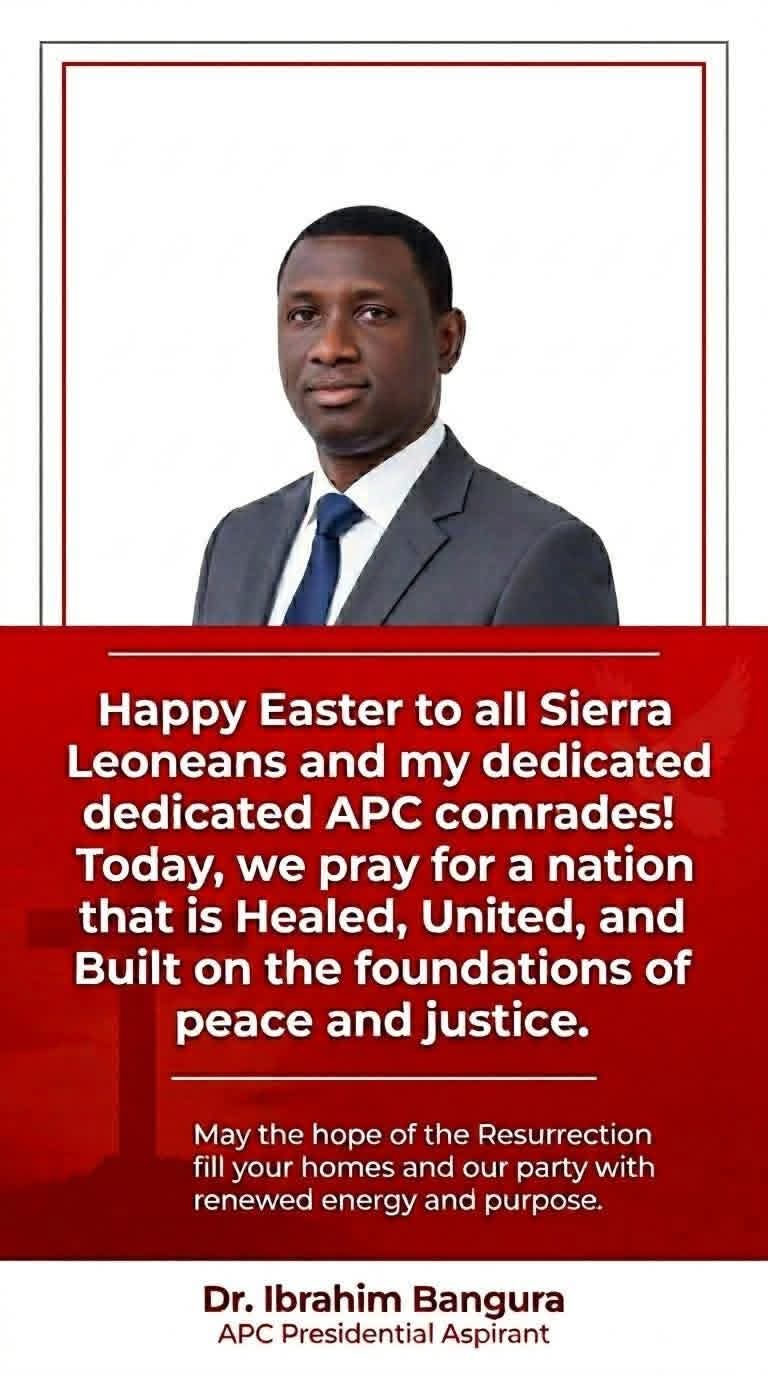 Dr. Ibrahim Bangura, a leading presidential aspirant of the main opposition All Peoples Congress (APC), has issued an Easter message calling for a Sierra Leone that is healed, united, and built on the foundations of peace and justice.