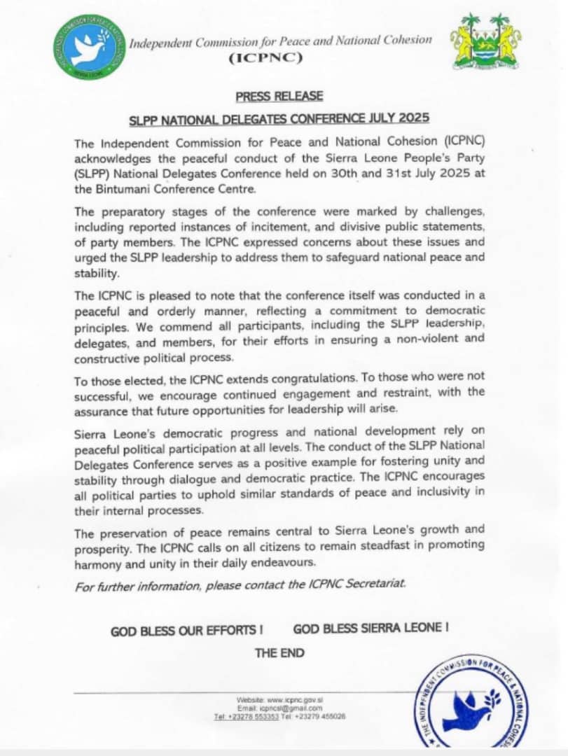 On August 4, 2025, the Independent Commission for Peace and National Cohesion [ICPNC] issued a statement commending the ruling Sierra Leone People’s Party (SLPP) for its recently concluded National Delegates Congress, held on July 30 and 31, 2025. The commission described the conference as peaceful and conducted in an orderly manner, reflecting a commitment to democratic principles.